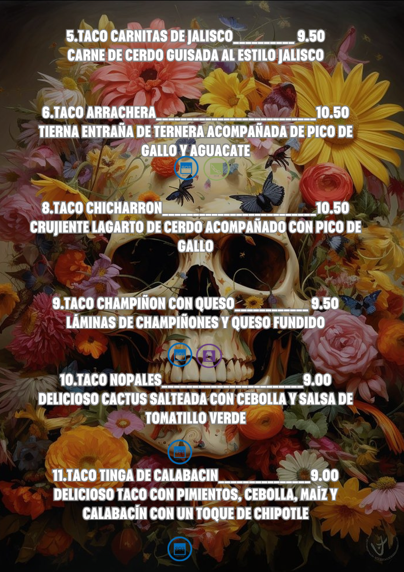 A elegir dos de las siguientes opciones: Alambre de pollo, tinga de pollo, cochinita o gringa